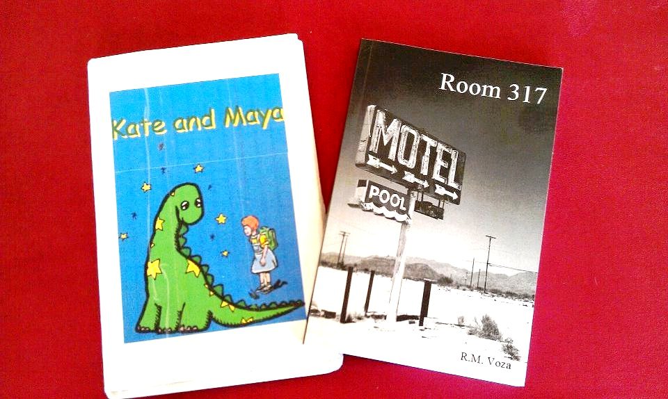 The book on the left is a kids book, Kate and Maya, written about 15 years ago.  I printed it with my computer, found two pieces of cardboard, got some clear and wide tape, and basically made a book for my kid.  It’s published to the extent I want it to be, at this point.  It’s a really cute story about Kate, a 4-year old girl who finds a toy dinosaur in her grandmother’s yard.  It comes alive and tells Kate about another little girl, Kate’s mother, who used to play with her until she lost her in the yard one day and also lost her imagination about playing with toys.