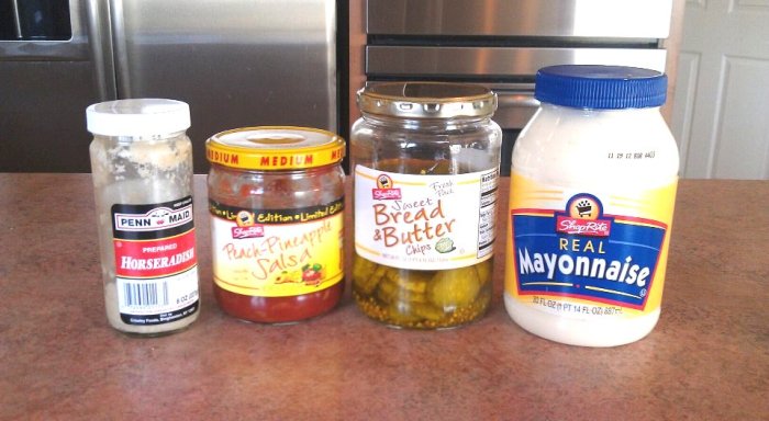 Get a small bowl, dump in a tablespoon of mayo, then have fun.  Teaspoon of salsa goes in for color and flavor.  I don’t actually use pickles, just the juice from the jar.  Careful with the horseradish.  Tastes great but could singe nose hair.  Ladies probably don’t have to worry about that, unless you’re an Olympic athlete from an Eastern bloc nation.