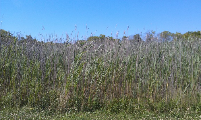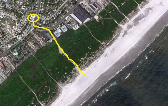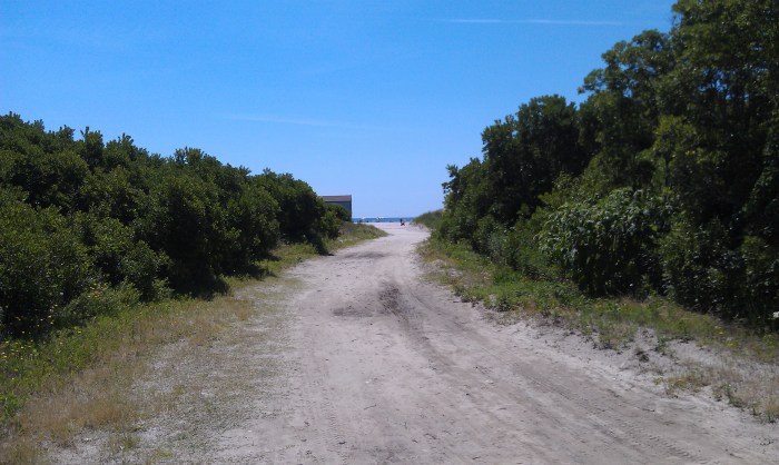 Here’s another picture.  It’s the path I walk to get to the beach and the marshes on each side.  It’s a nice walk, gets the blood flowing.  Not sure why that’s necessary, but it doesn’t hurt to mention it.  If you’re at the beach when the wind is blowing out, you’re not going to like it.  You’ll get bit up something nasty.  Bug spray helps, but it’s not fool proof.  On those days, I stay home and put my chair on the deck, trying my best to erase the “white” that I mentioned before.  Yeah, like that.