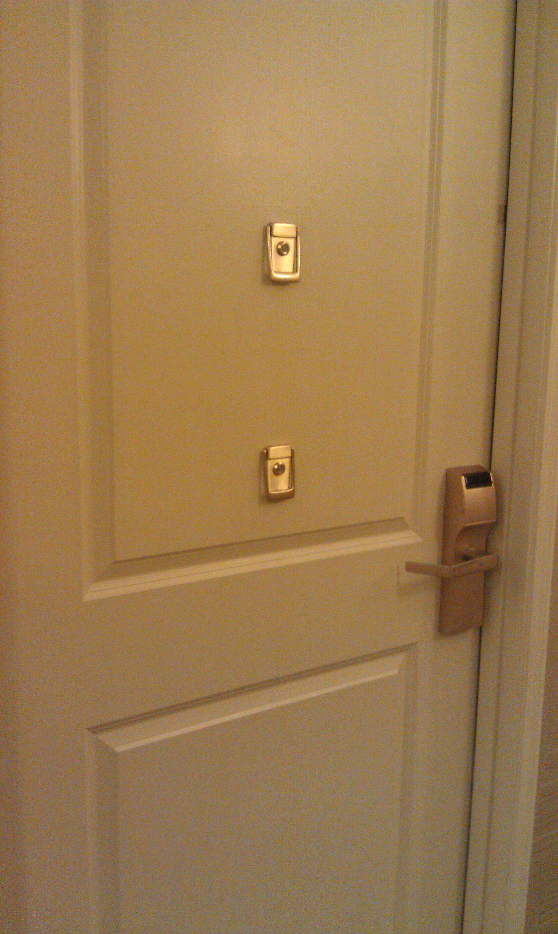 6.  I do stupid things.  Look at this door to the room across the hall from mine.  See the two different door knockers and peep holes?  I thought it was the cutest thing.  When I saw a hotel staff member approaching, I asked, “Hey, that door.  That’s cool.  Is that for kids?”  He said, “No, sir.  That’s for disabled people, like those in wheelchairs.”  All I could do was imagine that someone was wheeling up behind me right then and there to give me some kind of evil eye, which would be fully deserved.