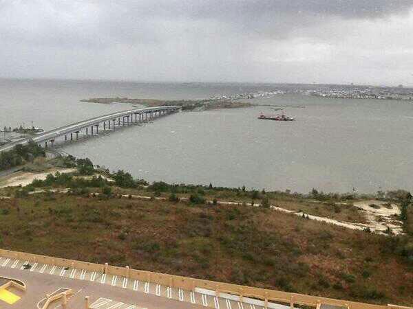 My thanks to those sending well wishes to me and my hurricane-ravaged town of Brigantine, NJ.  It’s a beautiful beach town that’s immediately north of Atlantic City.  The picture below was taken from an AC casino and shows the one bridge in and out of Brigantine.  Five years ago, when I was scouting for a beach place, a great friend told me to go there because it’s just a great little town that happens to have a big, fabulous beach.  I’ve posted beach pics and other info over the past few years, and hopefully you’ve seen some of it.