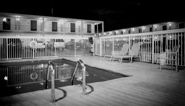The brightly-lit motel had a sign that boasted free breakfast and Wi-Fi.  It was good enough not to announce mirrored ceilings.  The pool was like glass but empty, the still surface perfectly reflected a few of the brighter stars in the night sky.