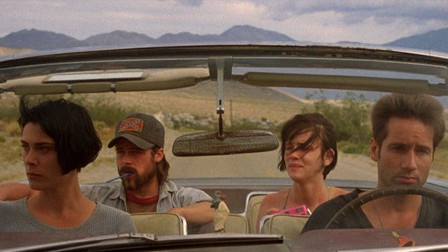 A writer, Brian Kessler (David Duchovny) and his girlfriend / photographer, Carrie Laughlin (Michelle Forbes) must travel from Pennsylvania to California while researching serial killers for the book he has not yet written but owes to a publisher. However, because Kessler already spent the advance and has little to show for it, he posts an ad at a local college looking for riders heading to California and willing to pay for gas money. The coincidence arrives in the form of Early Grace (Brad Pitt) and Adele Corners (Juliette Lewis). He’s a violent parolee who can’t keep a job. She’s, well, she – um – she’s an under-educated waitress who doesn’t mind showing skin and likes cactus plants. Early’s parole officer sends him to a local college for a custodian job, but instead of the job, he finds and answers Brian’s ad for a rider. Thus, a coincidence is born.
