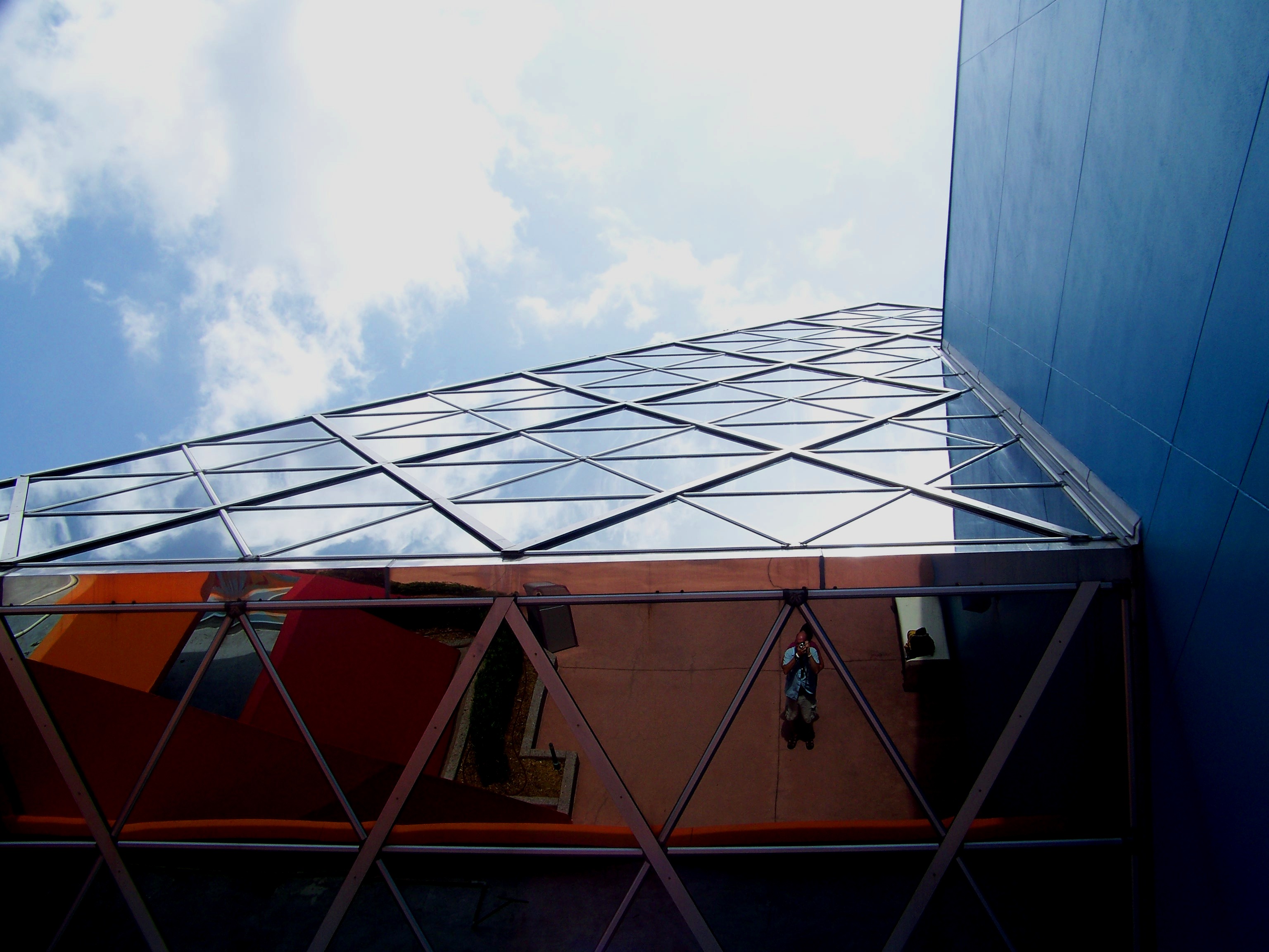 we were in epcot center and had just come out of the “figment” ride when the kids had to use the restroom.  while waiting, i noticed the interesting side of the pavilion, mirrored, and the cornflower blue sky above, intermittent clouds.  i tried ti keep myself out of the picture, but it didn’t work out.  ten feet away, kids were whizzing.  go figure.